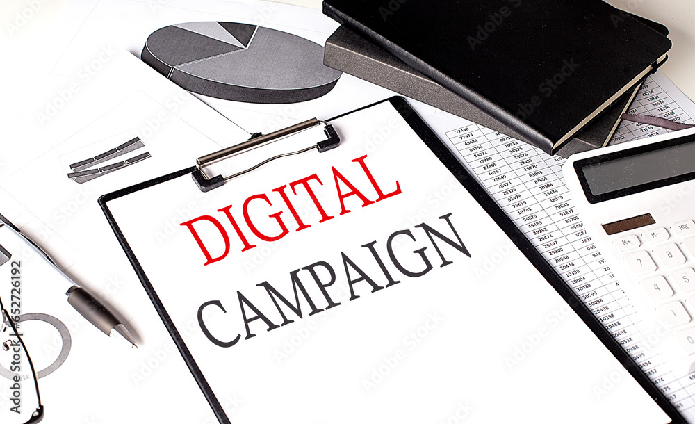 DIGITAL CAMPAIGN text on paper clipboard with chart and notebook on withe background