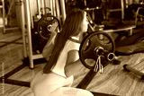 A beautiful girl is engaged in a gym with a barbell