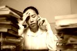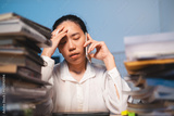 Female businesswoman, manager or employee having a stress, exhausted and tired talk with customer by mobile phone at night time. Concept of exhausted from deadline work, overwork document or data.