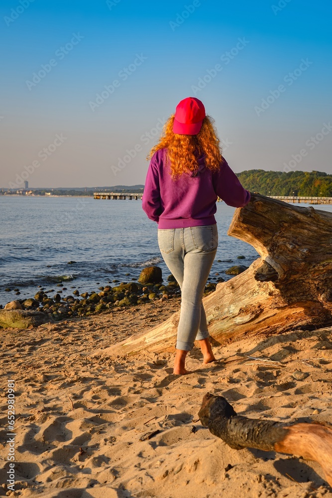 Morning scene with a woman on the beach. Female tourist on the beach in Gdynia on the Baltic Sea in Poland admiring the views.