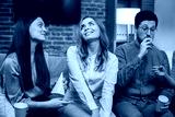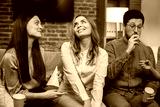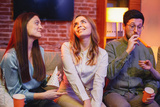 Friends sitting on a sofa in a cozy room and celebrating birthday