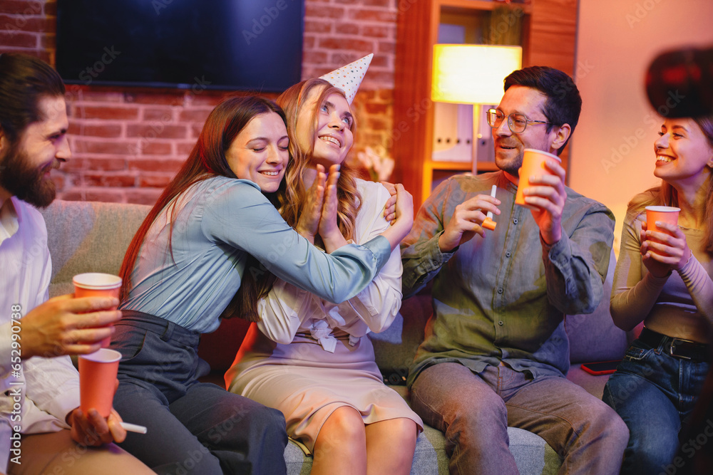 Friends sitting on a sofa in a cozy room and celebrating birthday