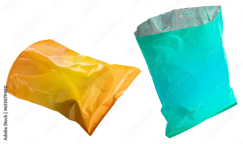 Empty Foil and plastic snack bags mockup isolated on white background, Yellow pillow packages for food production, snack wrappers on White Background PNG File.