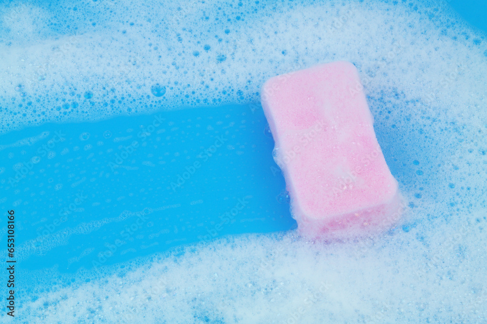 Pink sponge with foam on blue background. Washing and cleaning concept.