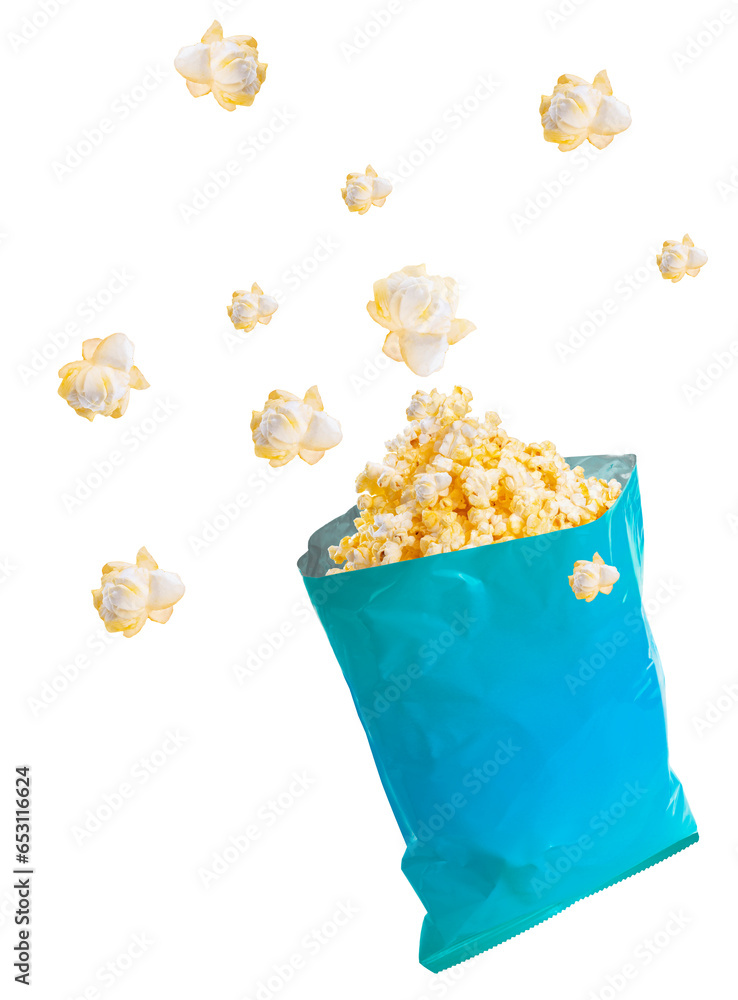 Popcorn fly out of yellow bag isolated on white background, Popcorn on white PNG File.