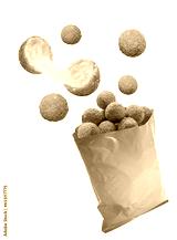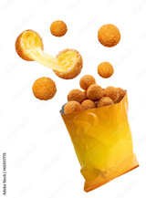 Crispy Cheese fly out of yellow bag isolated on white background, Cheese ball or cheesy puffs on white PNG File.