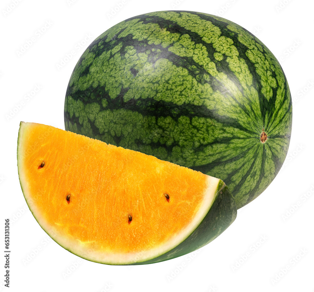 Orange Watermelon with leaves isolated on white background, Watermelon on a white background PNG File.