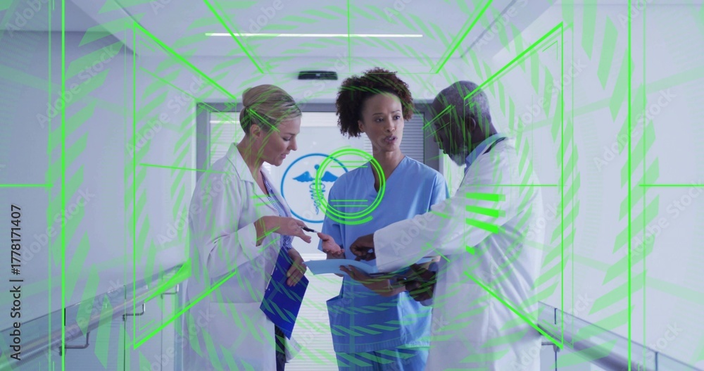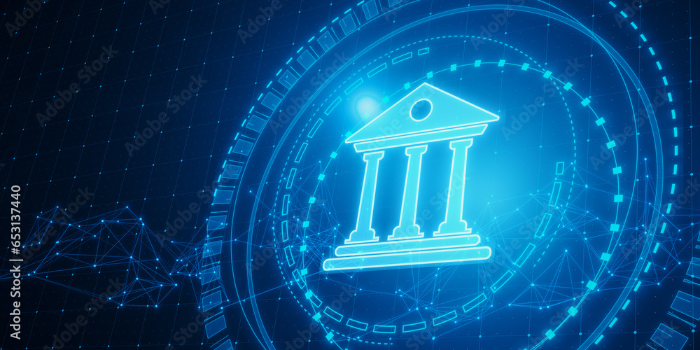 Creative polygonal round banking hologram on blurry wallpaper. Digital transformation and finance concept. 3D Rendering.