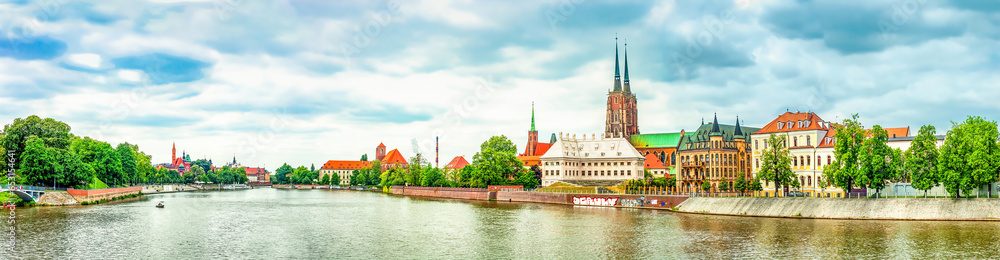 Wroclaw old town summer wide panorama with buildings, churches, river Oder in Poland