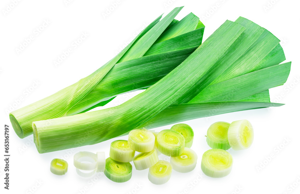 Fresh green leek stems and leek slices isolated on white background. File contains clipping paths.