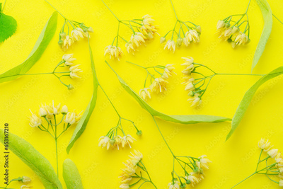 Collection of linden flowers, linden bracts and leaves isolated on yellow background.