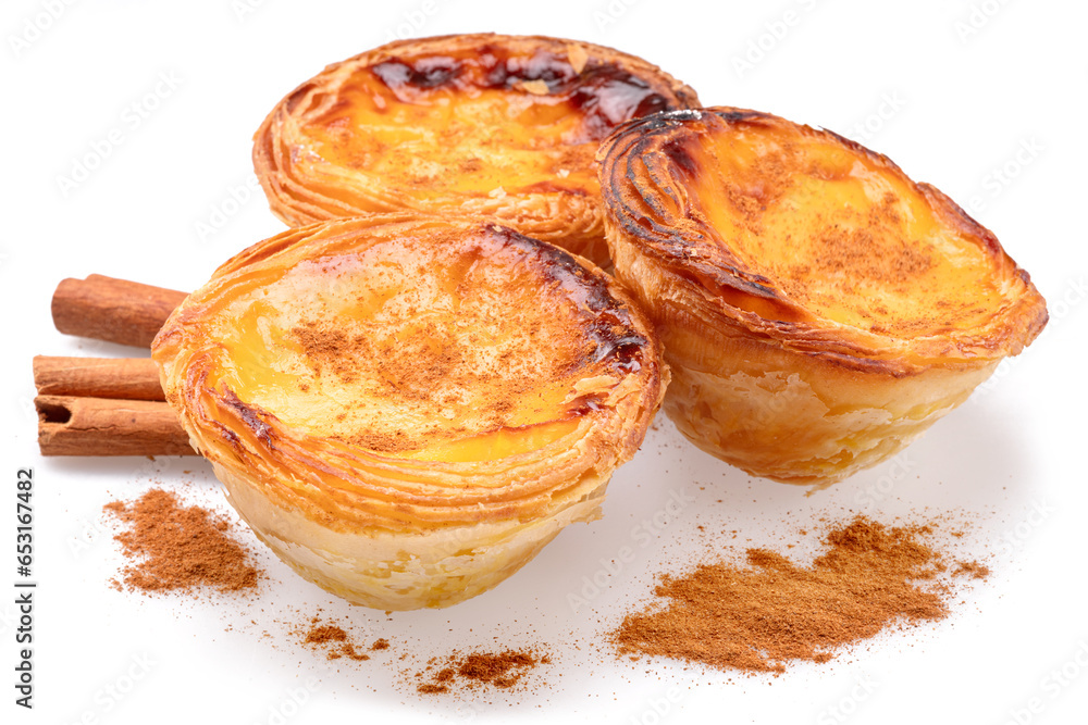 Pastel de nata tarts and cinnamon sticks isolated on white background.