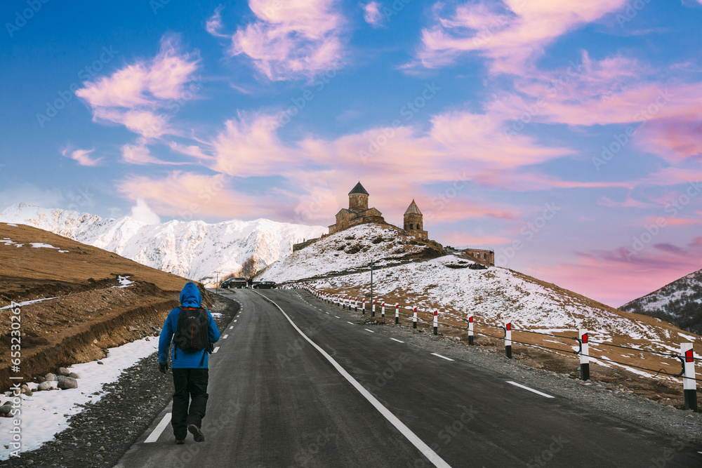 Stepantsminda, Gergeti, Georgia. Man Tourist Backpacker Traveler Photographer Walking To Holy Trinity Church - Tsminda Sameba. Beautiful Georgian Landscape In Early Winter.