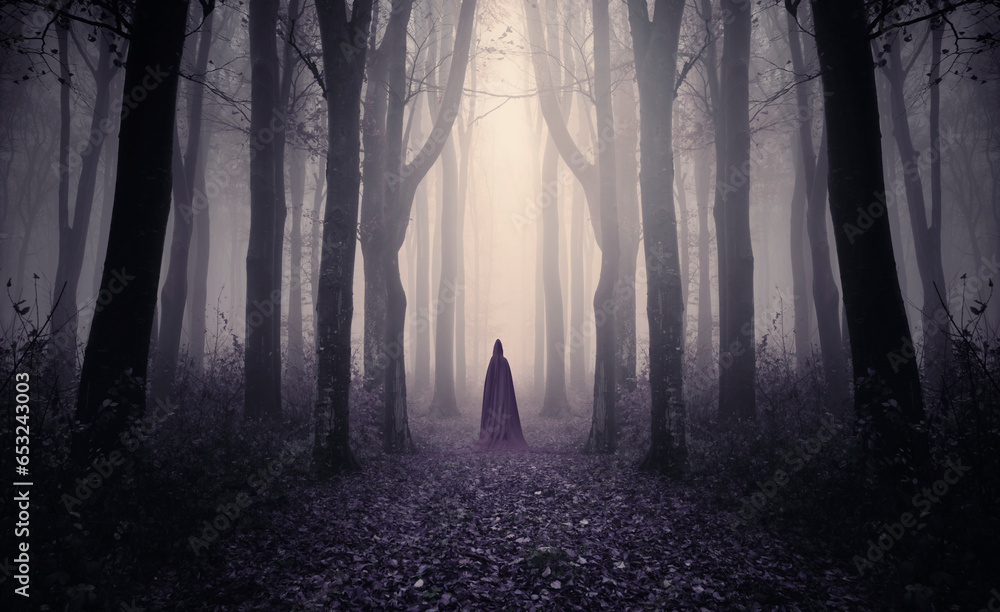 fantasy forest landscape with cloaked silhouette on magical path