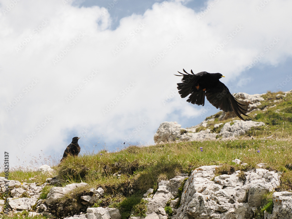 Alpine Chough, also known as the Yellow-billed Chough, a distinctive and charismatic bird species found in the Dolomites mountains, a breathtaking mountain range in northern Italy.