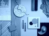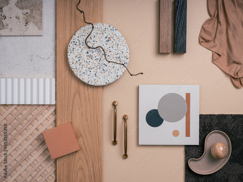 Aesthetic flat lay composition with textile and paint samples, panels, handle and cement tiles. Stylish interior designer moodboard. Light beige color palette. Copy space. Template.
