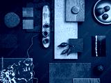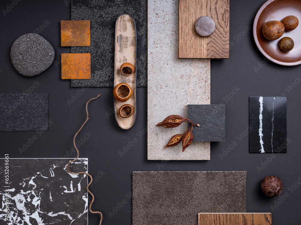 Aesthetic flat lay composition in grey and navy color palette with textile and paint samples, lamella panels, leaves and tiles. Architect and interior designer moodboard. Top view. Copy space.