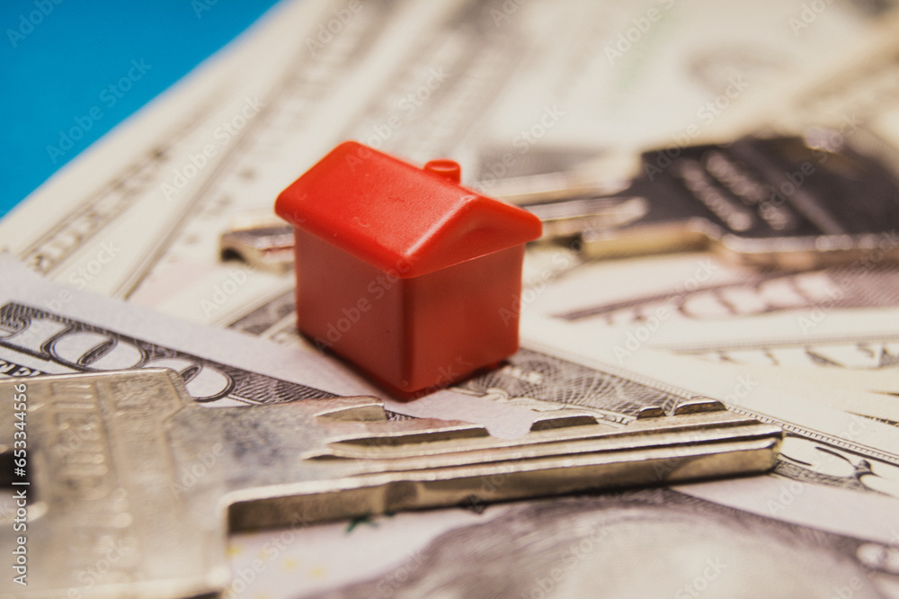 close-up of a red house next to a key and American dollars. Concept showing real estate purchase, mortgage loan