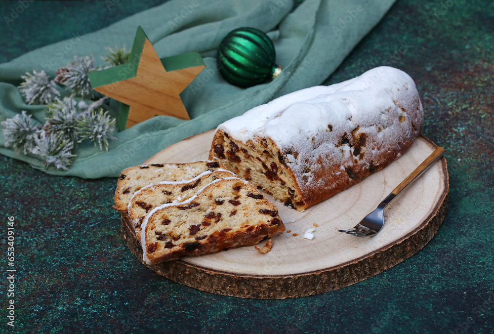 Traditioneller deutscher Weihnachtskuchen: Christstollen auf einer Baumscheibe mit Gabel und Weihnachtsdekoration.