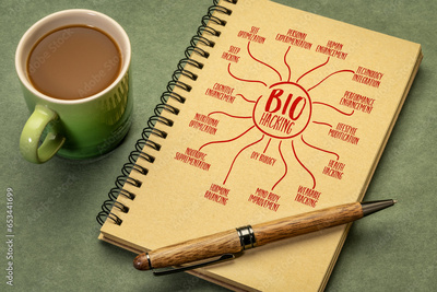 biohacking infographics or mind map sketch in a spiral notebook with coffee, personal development, health and performance concept
