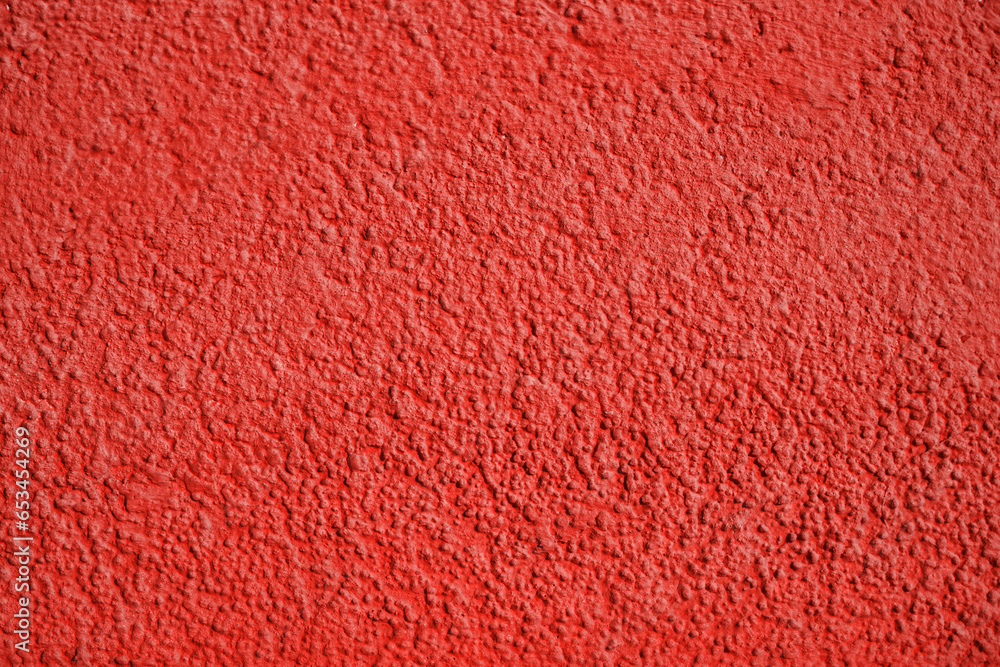 Home facade texture. Red rough surface. Grunge grain. Crushed rocks in the wall. Exterior home decoration. Stucco wall pattern. Red color retro design. Noisy design background.