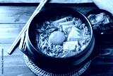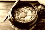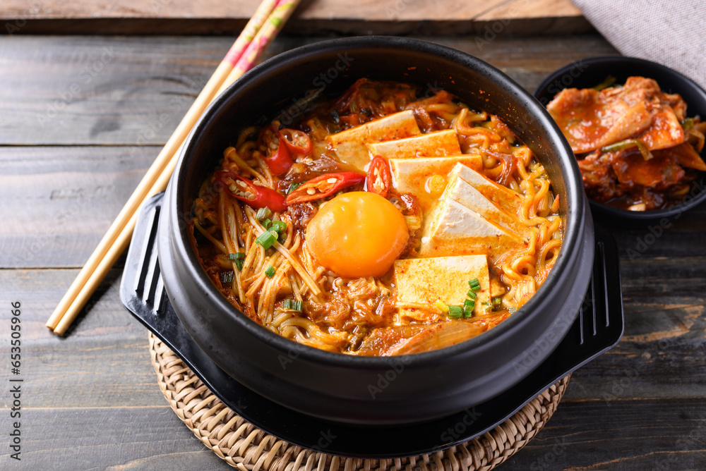 Korean spicy noodle soup with kimchi, tofu, egg and mushroom in Korean stone bowl