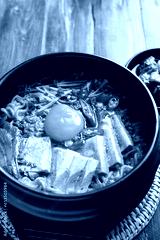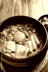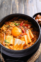 Korean spicy noodle soup with kimchi, tofu, egg and mushroom in Korean stone bowl