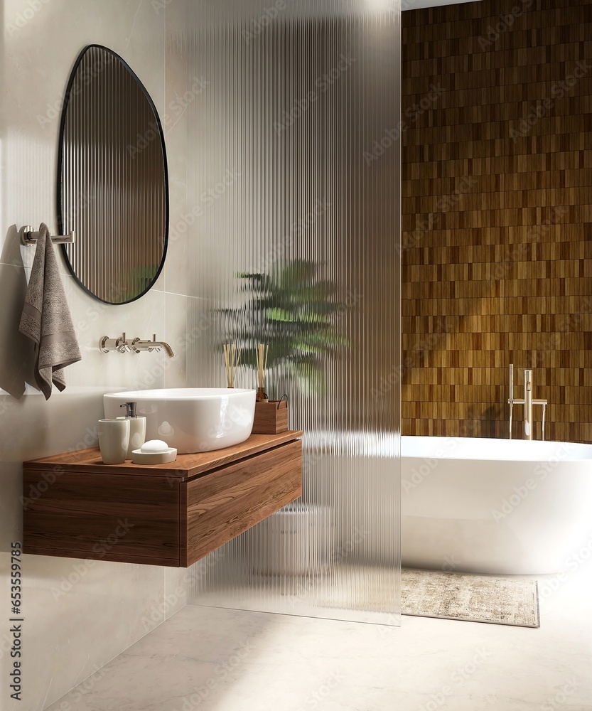 Luxury bathroom with bathtub, reeded glass partition, vanity counter, washbasin in sunlight from window on marble floor, brown tile wall. Interior design decoration, toiletries product background 3D