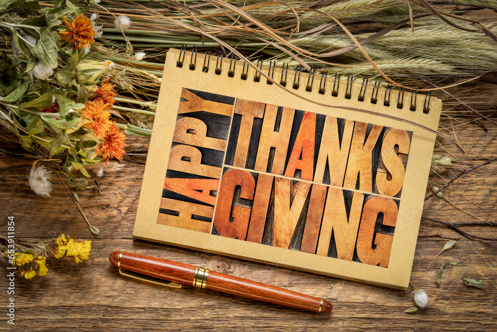 Happy Thanksgiving test in vintage letterpress wood type in a spiral notebook with floral bouquet of dry flowers and grain stalks, fall holidays concept