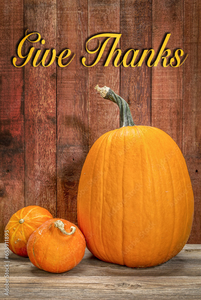 Give Thanks - a greeting card with a pumpkin and hubbard winter squash against rustic barn wood