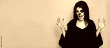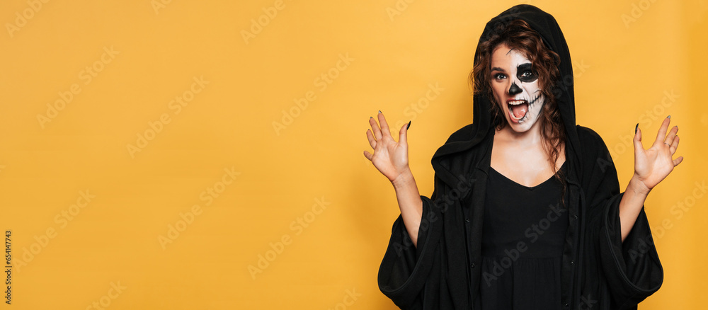 A young woman in a hood with scary makeup. on a yellow isolated background. Concert costume party. A place for your text, advertising. Banner.