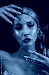 Portrait of a stylish young woman with a platinum blonde hairstyle and perfect makeup. A fashionable model girl with perfect skin and trendy pink lips.