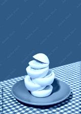 Sliced, hard-boiled eggs on blue plate, on checkered tablecloth over blue background. Concept of breakfast, food, taste, health, creativity. Pop art photography. Poster. Copy space for ad