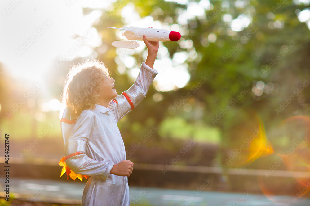 Little boy playing with spaceship. Astronaut kid.