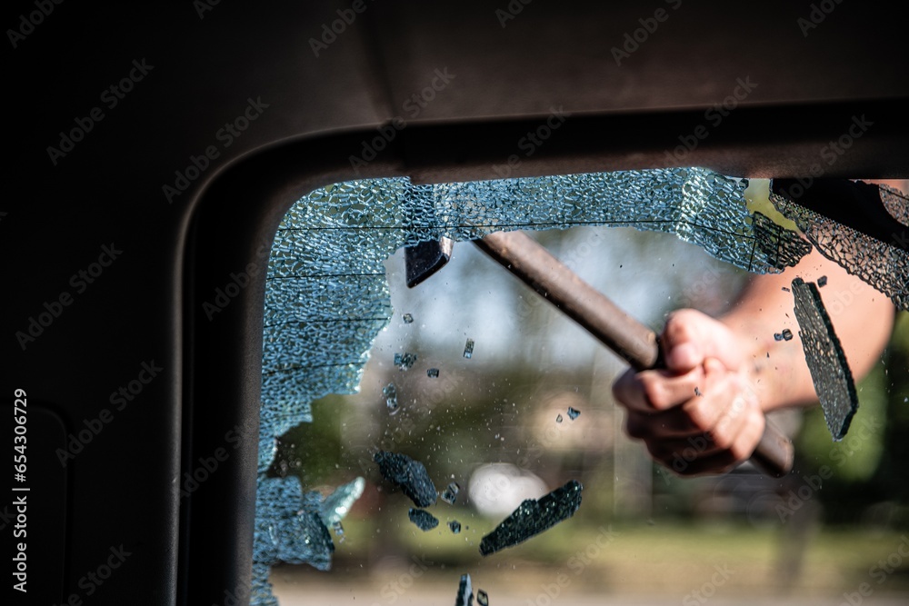 Car thief breaks the car window with a hammer