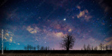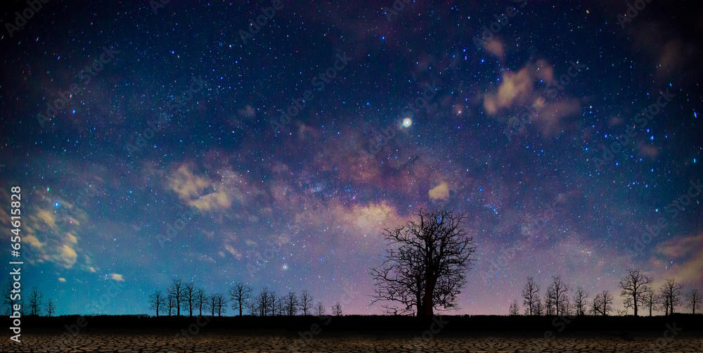 The Milky Way and trees on the dark ground. An old tree in the night sky With stars and the purple Milky Way . night landscape Space background, galaxy, travel. wilderness, nature, forest, mountain