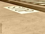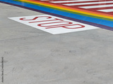 Edge of a colorful zebra crossing with the word Stop painted on the road