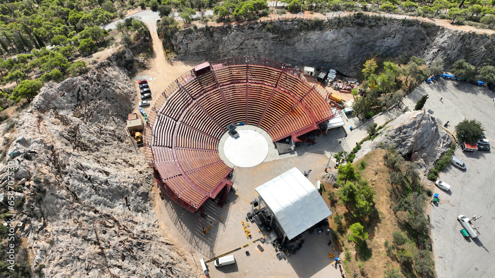 Aerial drone photo of recently renovated theatre of Lycabettus on top of Lycabettus hill, Athens centre, Attica, Greece