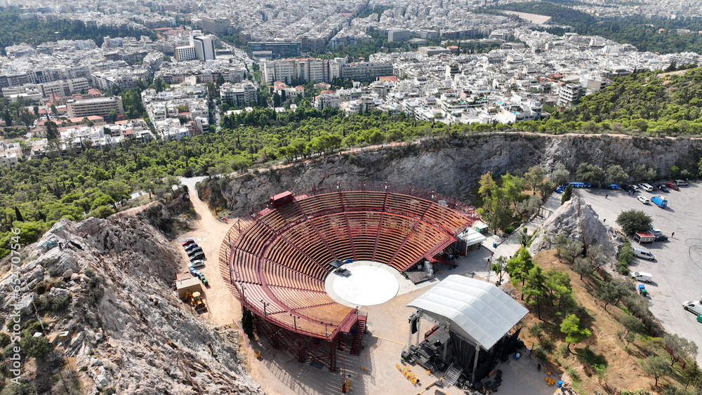 Aerial drone photo of recently renovated theatre of Lycabettus on top of Lycabettus hill, Athens centre, Attica, Greece