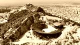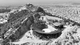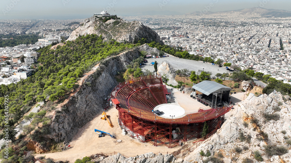 Aerial drone photo of recently renovated theatre of Lycabettus on top of Lycabettus hill, Athens centre, Attica, Greece