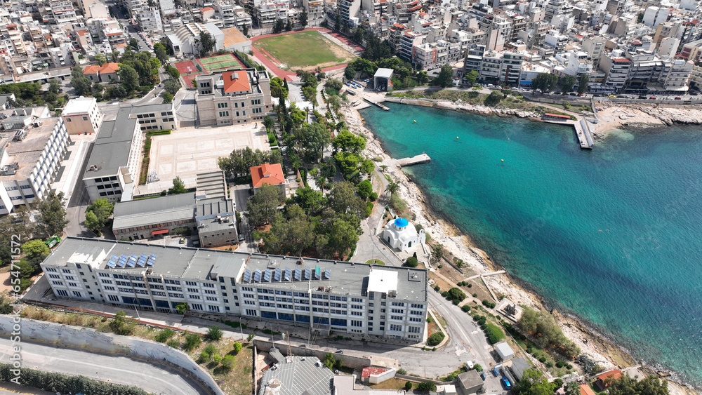 Aerial drone photo of small cosy bay of Hellenic Naval and coast guard Academies in Piraiki area of Piraeus port, Attica, Greece