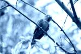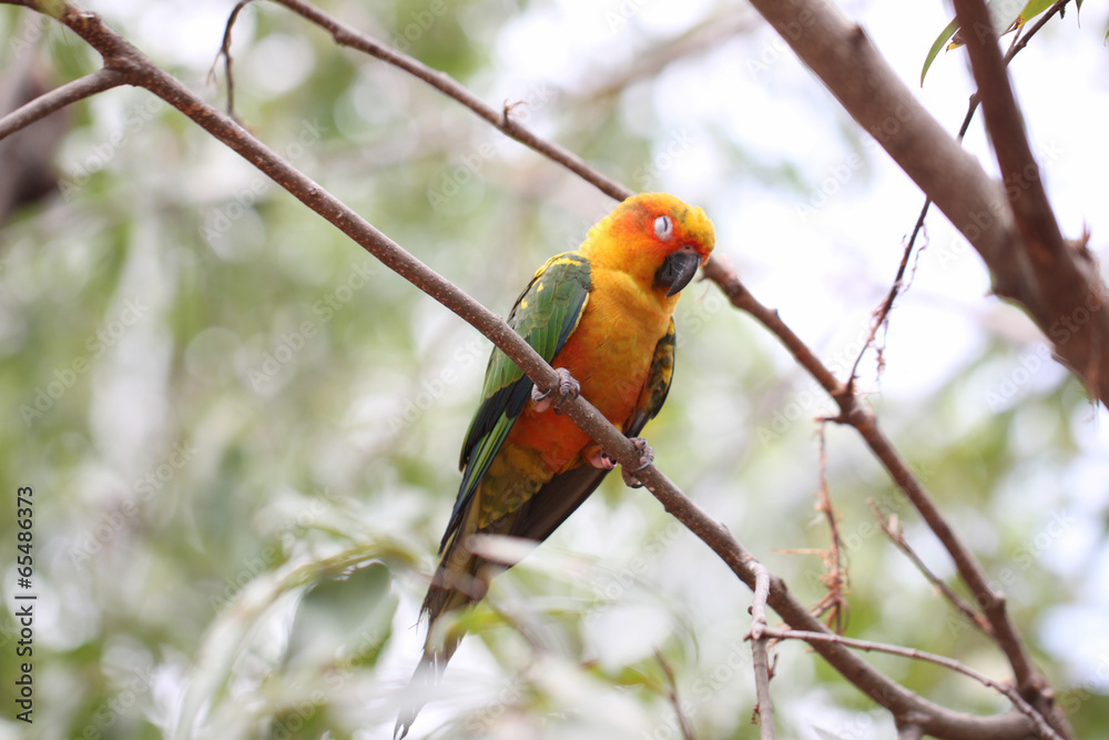 parakeet or parrot is sleeping on tree branch.