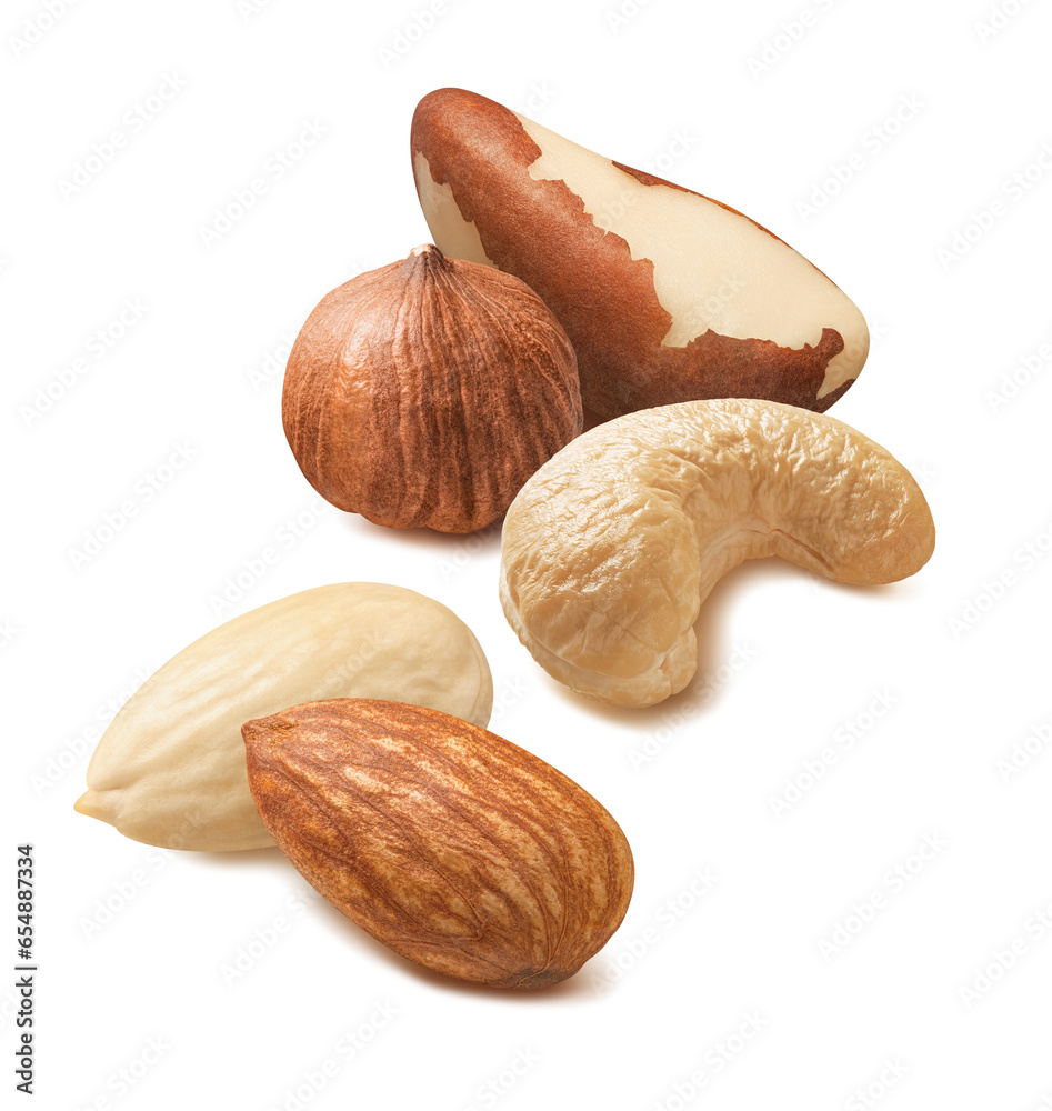 Brazil nuts, cashew, blanched almond and hazelnut isolated on white background