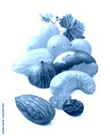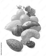Blanched almonds, hazelnuts, cashew, brazil nuts, green grapes and raisin isolated on white background