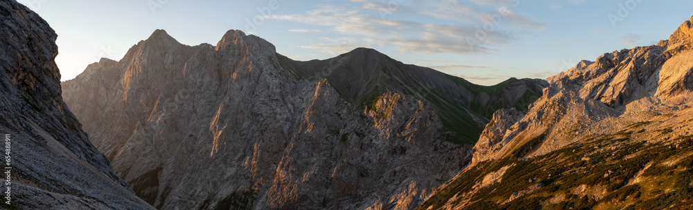 Hochwanner, Kleiner Wanner and Hoher Kamm peaks in Wetterstein Mountains in the Alps during golden hour sunrise