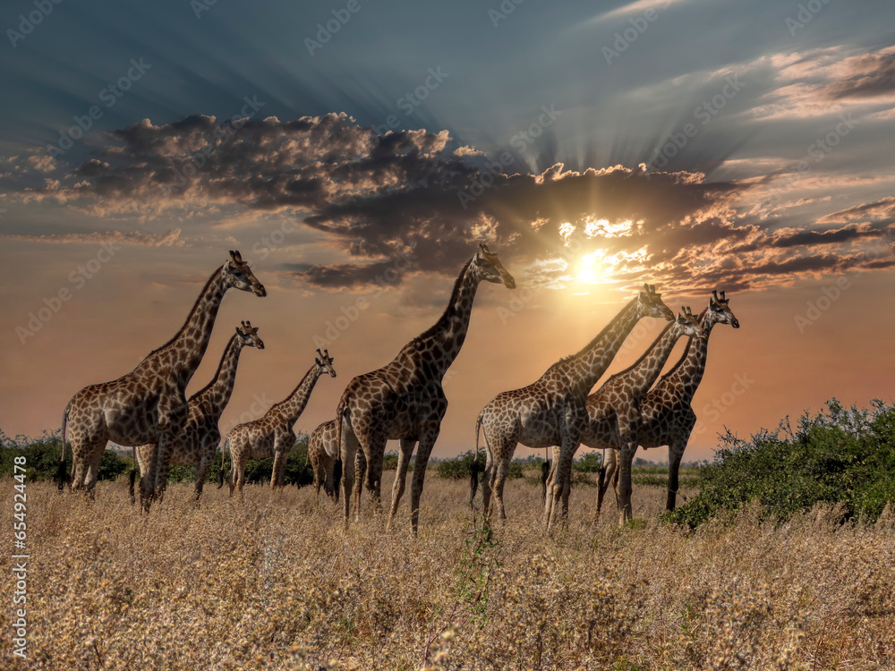 herd of giraffes grazing and walking in the plains of northern Botswana at sunset