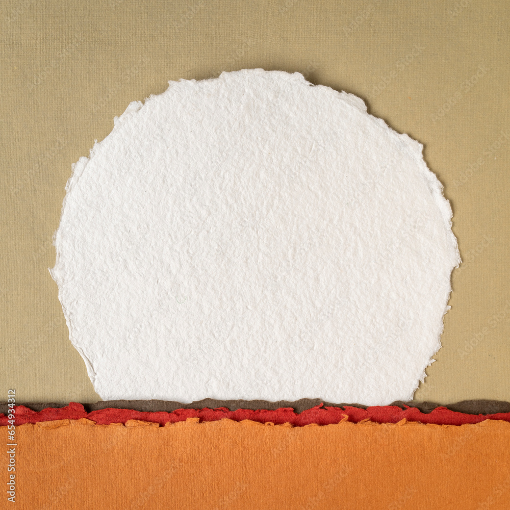moon or sun rising over abstract colorful landscape, blank circular watercolor paper