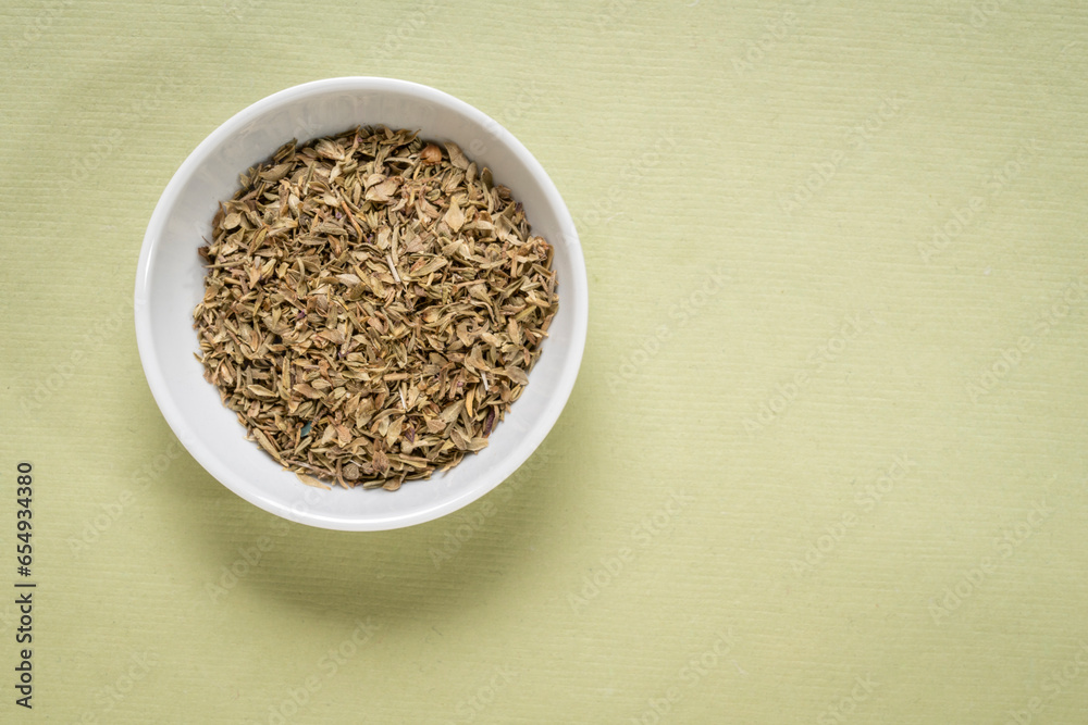 oregano dried herb - small ceramic bowl on textured paper with a copy space, top view