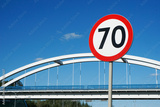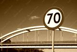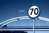 Road bridge with blue sky in the background. Road sign speed limit. 70 kmph maximum speed. Curvy construction bridge architecture. Arch bridge isolated on blue sky