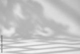 Shadow of tropical palm leaves and geometric shapes on white wall. Minimal abstract light white background for product presentation.